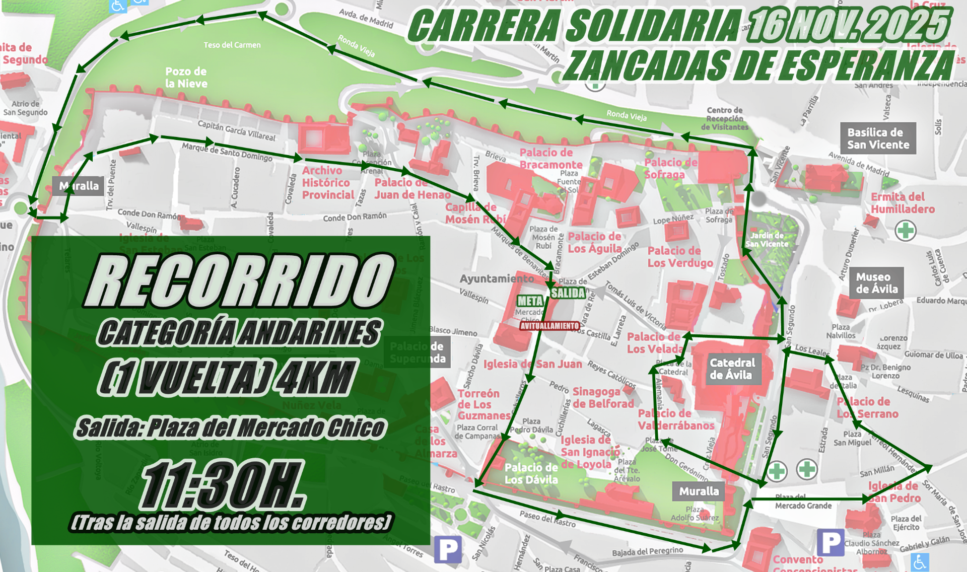 Salida: Plaza del Mercado Chico, Calle Caballeros, Arco del Rastro, Paseo del Rastro, Plaza de Santa Teresa, Calle del Duque de Alba, Calle de Don Ferreol Hernández, Plaza de Italia, Calle de los Leales, Calle de San Segundo, Puerta del Alcázar, Calle de Don Gerónimo, Plaza de José Tomé, Calle Alemania. Plaza de la Catedral, Calle de San Segundo, Plaza San Vicente, Ronda Vieja, Avenida Madrid, Puerta del Puente (Arco Vallespín), Calle Marqués de Santo Domingo, Calle Marqués de Canales y Chozas, Calle Marqués de Benavites, Plaza de Zurraquín, Plaza del Mercado Chico. (SÓLO UNA VUELTA y avituallamiento en este punto).
